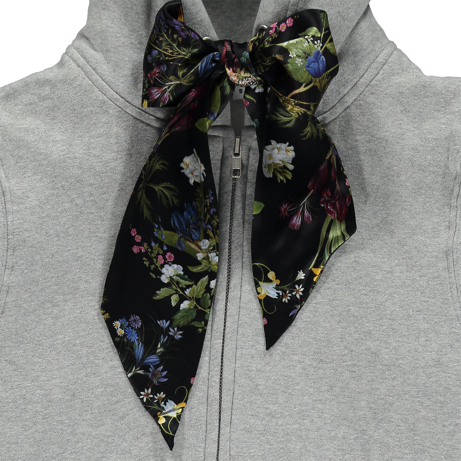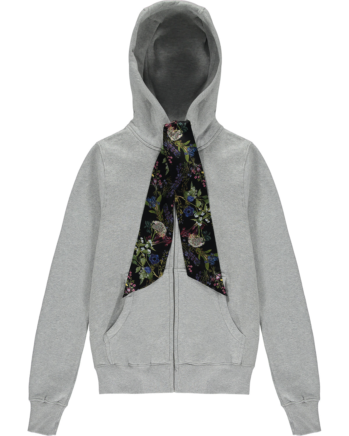 - Grey zip-up hoodie with black floral silk string