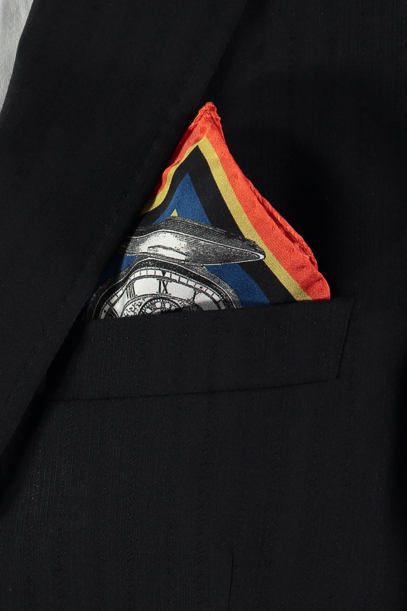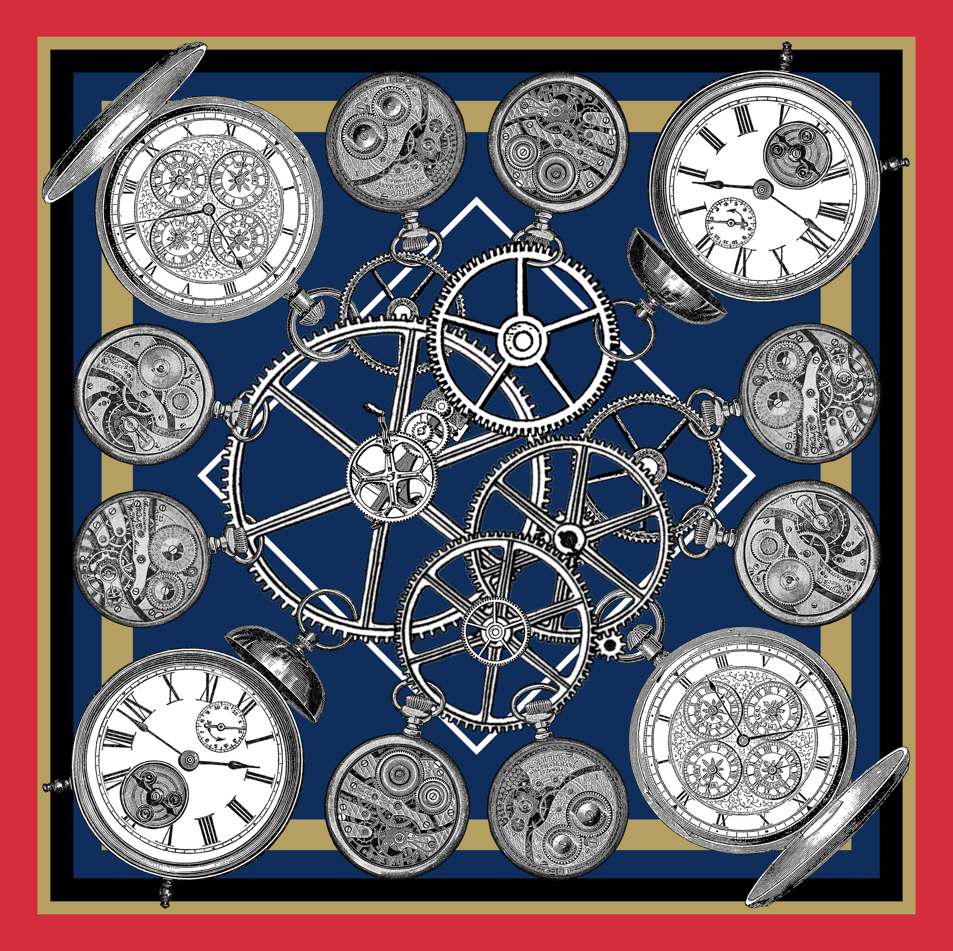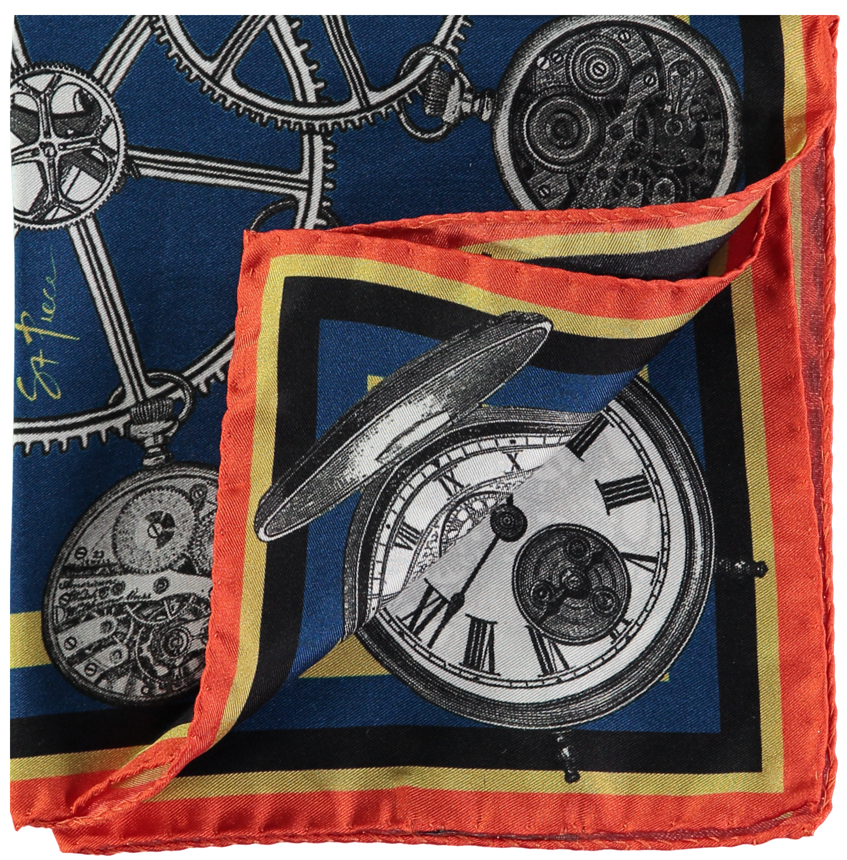 Printed and finished with glossy and lustrous silk twill in England. Dominic Blue pocket square takes the design back to the days of pocket watches, with all the mechanism, on a navy background with red and copper frames.