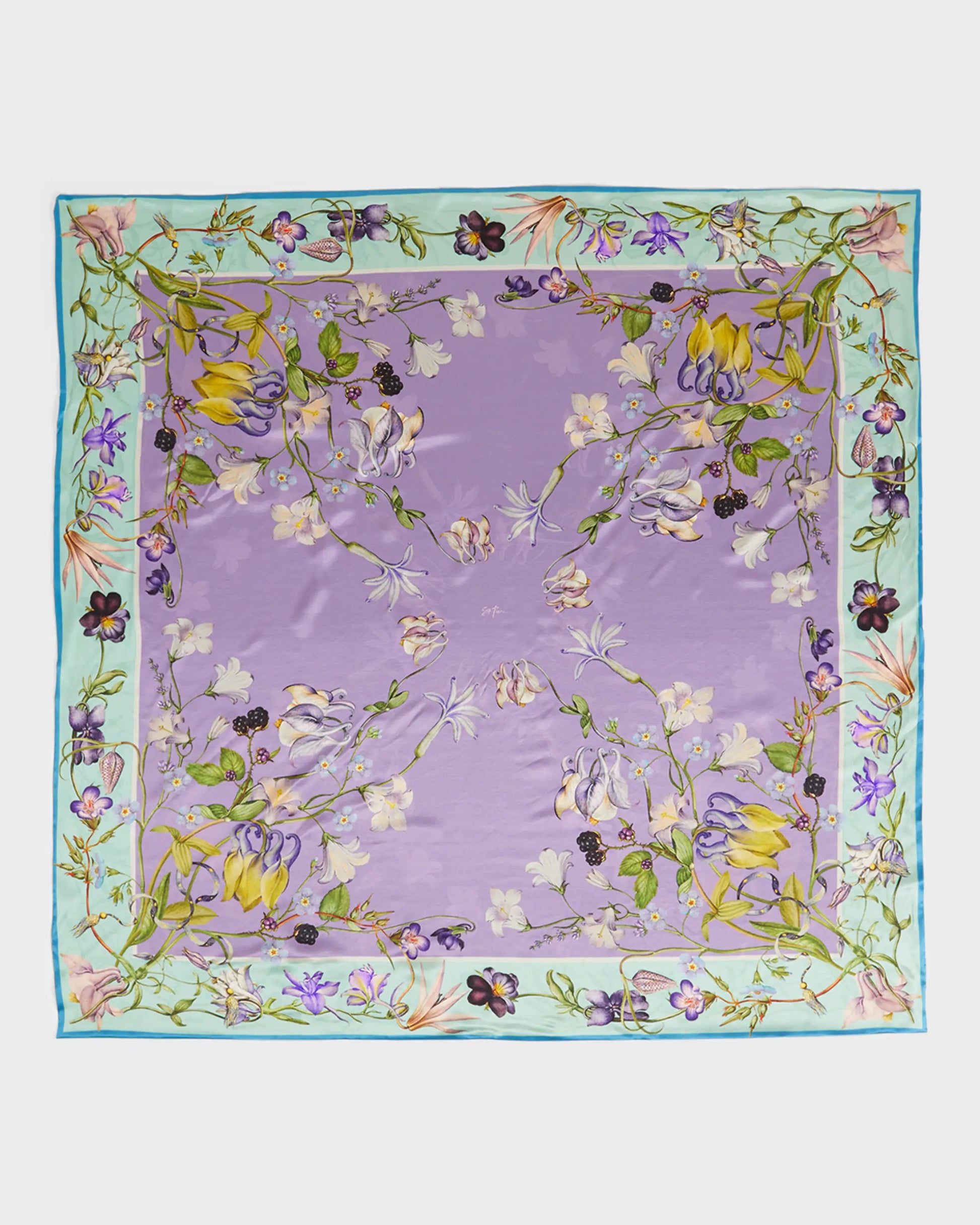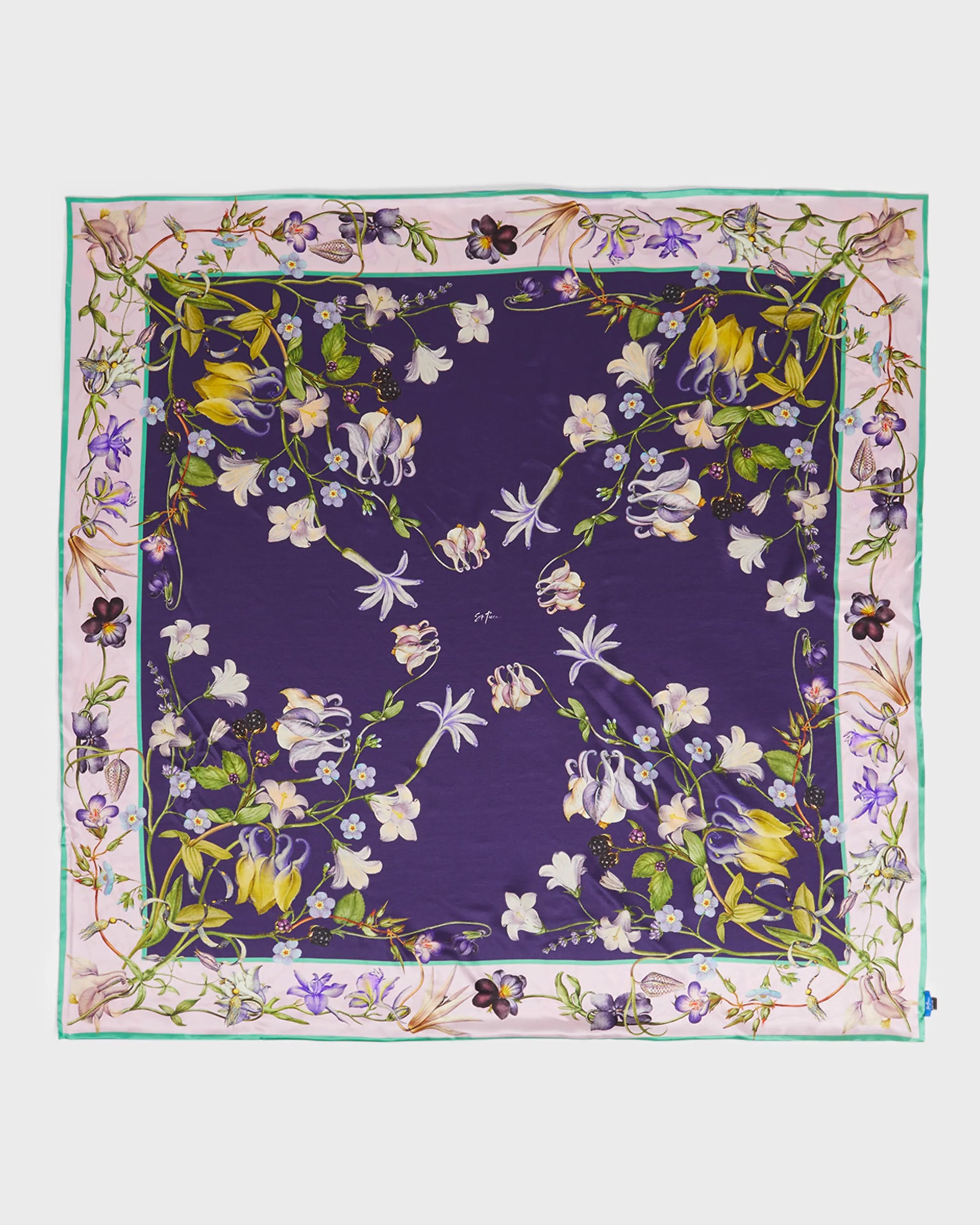 St. Piece's classic large silk double-sided silk scarf. Samantha Silk Double-Sided Scarf, a true masterpiece of elegance and charm. Delve into the world of sophistication with its dual-sided design, featuring a rich dark purple side adorned with a delicate pink border, and a serene lilac side complemented by a refreshing mint border. The Samantha print vintage-inspired flowers such as pansies, geraniums, and violets, lending a touch of nostalgic beauty to this exquisite accessory.