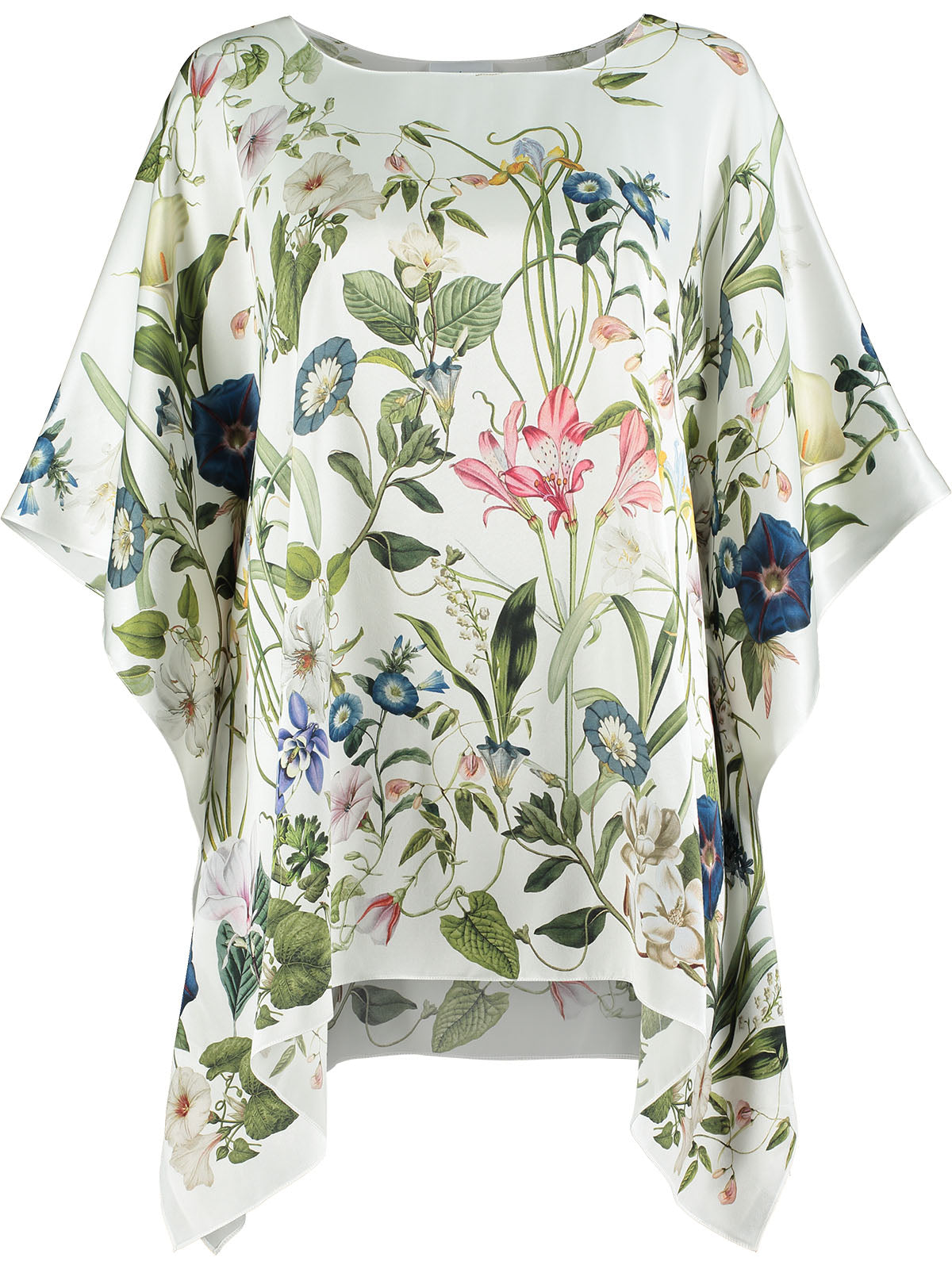 This white piece is crafted from silk satin, printed with opulent blooms. It's shaped to a voluminous frame and drops to an asymmetric fluid hemline, defined with a crew neckline. Left unlined so it feels light and soft against the skin. Layer it over a bathing suit and slip on a pair of slides to head from beach to brunch. The LEAH WHITE print is also available as a silk short kimono
